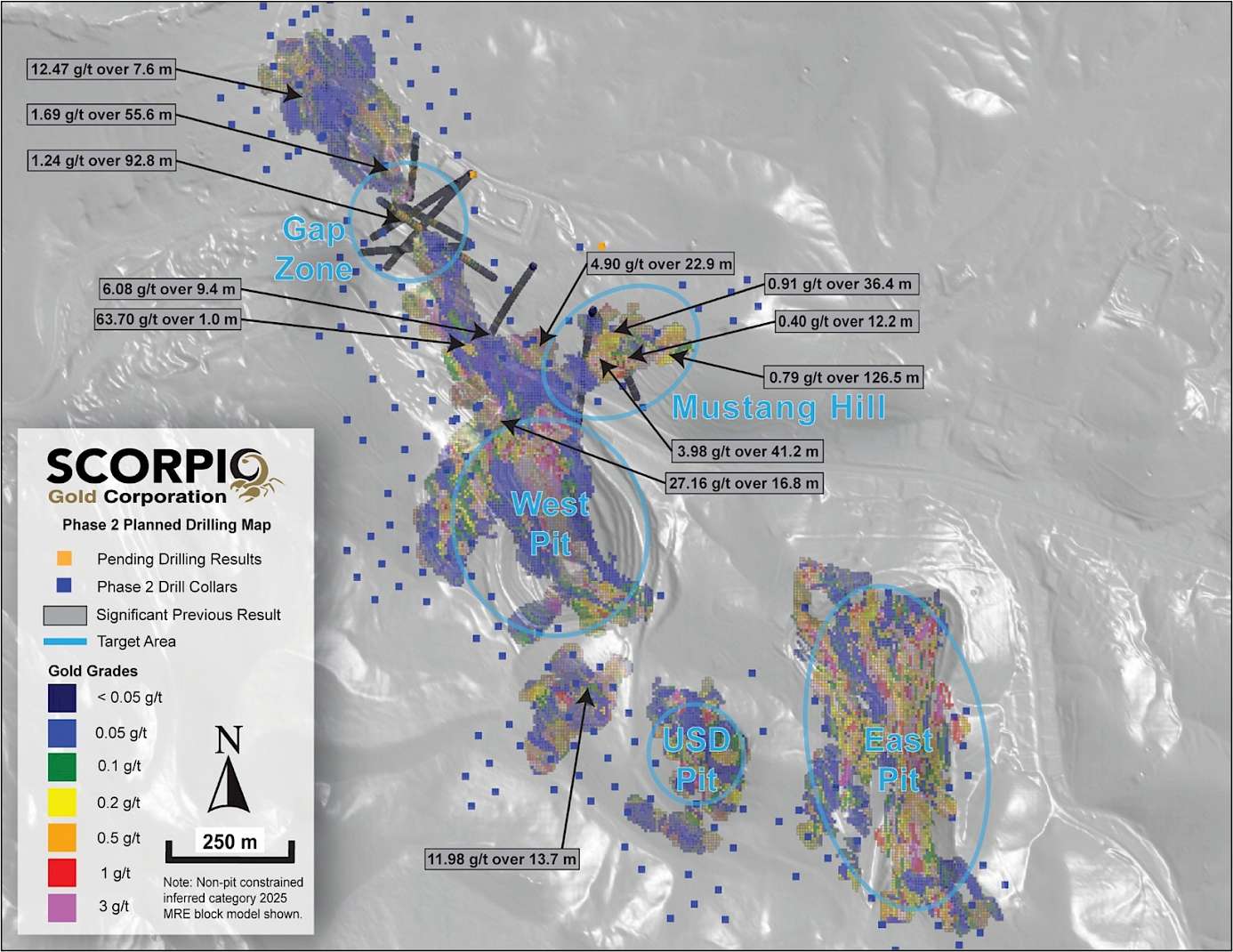This next phase will be executed using one diamond core drill and one reverse circulation drill, which are already drilling at site, along with a second diamond core drill, which is being mobilized. Three drills will enable a more aggressive pace towards completing a minimum of 50,000 metres of drilling in approximately 200 drill holes by the end of August 2026. This phase will primarily focus on systematically expanding the Mineral Resource Estimate (“MRE”) to the northwest of the West Pit, targeting both infill and step-out holes to extend the continuous mineralization along the Reliance Trend (see Figure 1). The second focus is to continue delineating strong near-surface mineralization at Mustang Hill and expanding the MRE to the southwest of the West and East Pits. The third focus is to convert non-compliant Historic Resources, notably at the Keystone Jumbo high-grade target (see news release dated September 11, 2025). Phase 2 is designed to establish an all-encompassing compliant NI 43-101 MRE for the Manhattan District and advancing Scorpio Gold’s near-term objective of defining a multi-million-ounce gold resource.