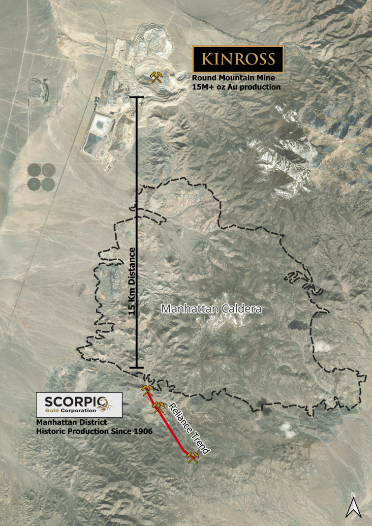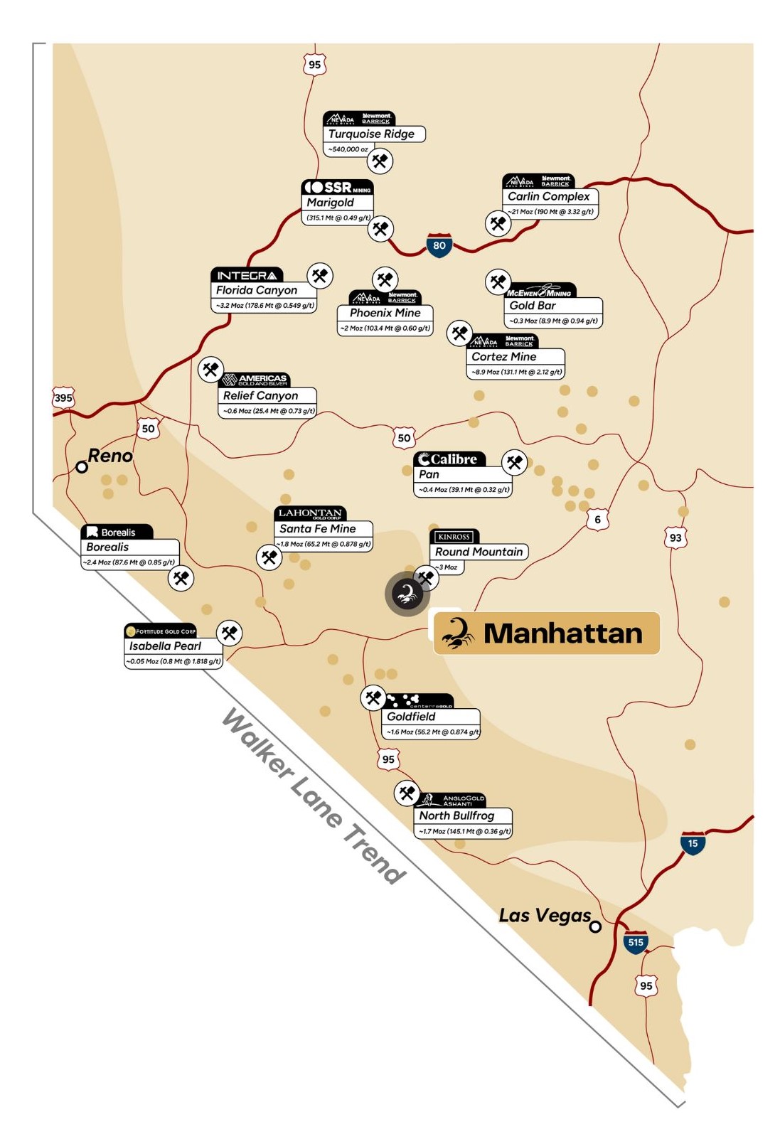 Situated on the southern periphery of the Manhattan Caldera, approximately 16 km south of the over 15-million-ounce Round Mountain Mine is the 100% owned Manhattan property.