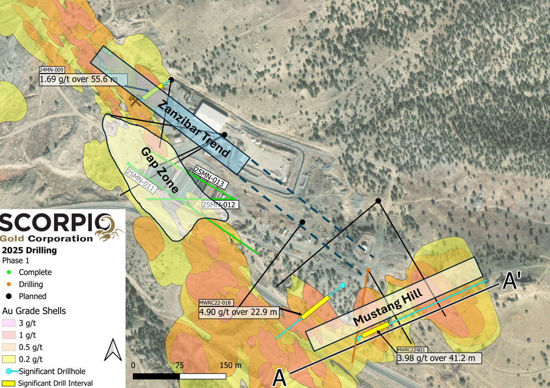 - Phase One drilling is focused on three target areas, the Gap Zone, located between the historic Goldwedge and West Pit mines the Zanzibar Trend, connecting the Goldwedge to the third target zone at Mustang Hill’s historic underground mines.