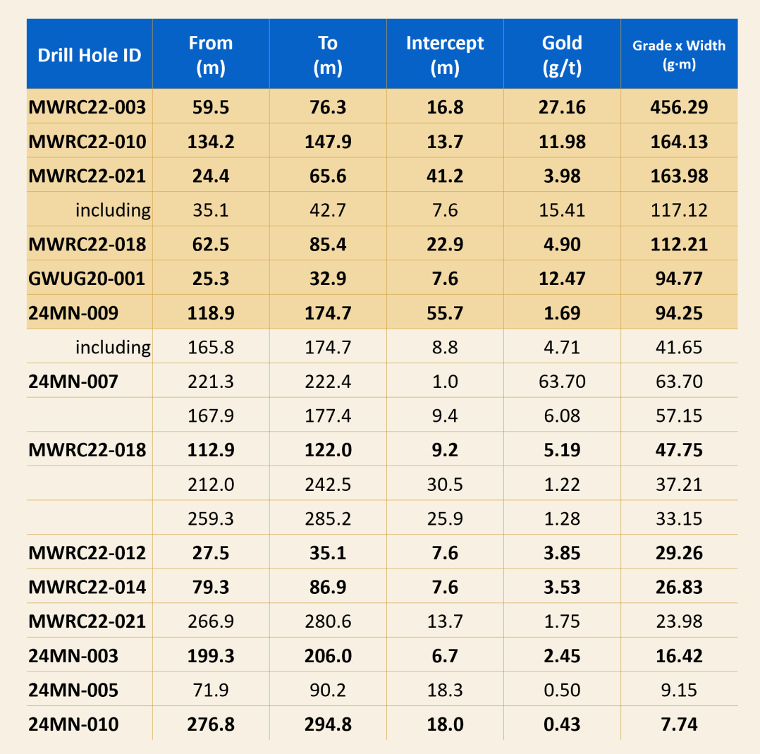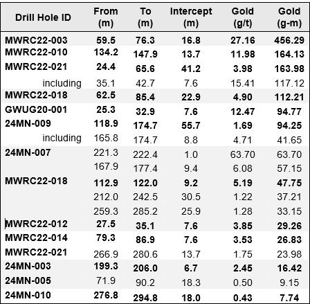 - Drilling aims to follow up on the intercepted Zanzibar Trend in hole 24MN-009, with an interval of 1.69 g/t gold over 55.6 m (see news release dated December 11, 2024), and Mustang Hill which was intercepted with an interval of 3.89 g/t Au over 41.2 m (see news release dated October 6, 2022 and Figure 3).